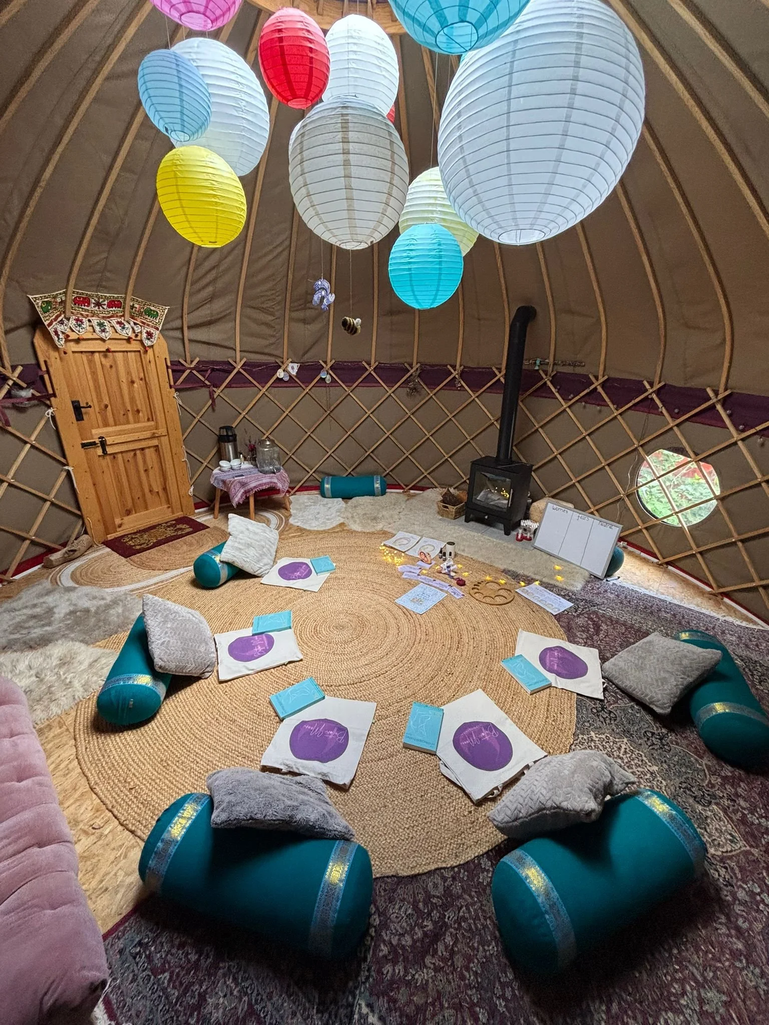 In a beautiful, cosy, magical Yurt with cushions, blankets, essential oils, twinkling fairy lights and a burning fire. Hosted in Barn Owl Yurt, Marton, Middlesbrough.